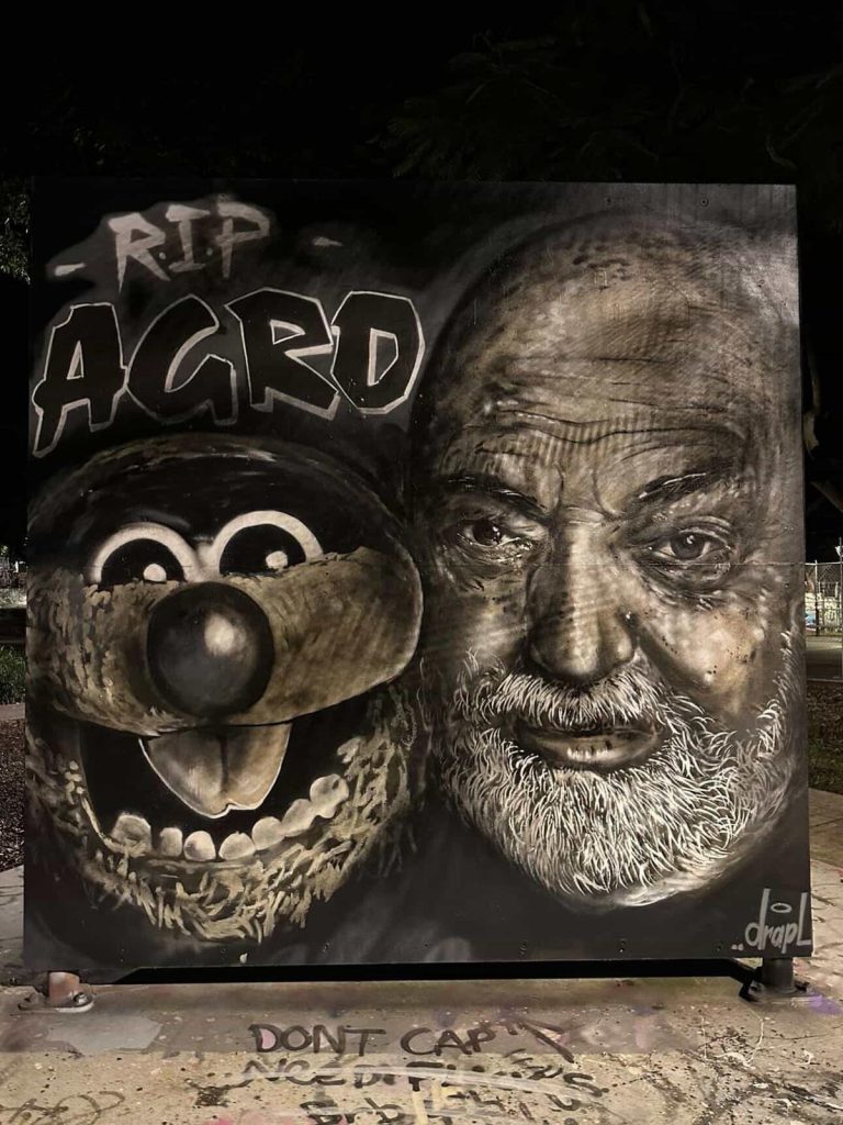A mural honouring late Brisbane entertainer Jamie Dunn appeared overnight at Paddington Skate Park, drawing locals to the site on Wednesday, 11 March. One of the skate park’s concrete walls had been transformed into a black-and-white portrait of Dunn alongside his famous puppet Agro, created overnight following news of his death on the weekend.