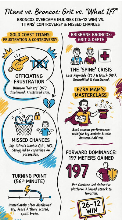 By the time the halftime siren for Round 5 of the 2026 Telstra Premiership echoed across the Gold Coast, the mood amongst the Brisbane faithful had shifted from jubilation to genuine anxiety. The Broncos held a slender 8-6 lead, but the cost was staggering: half the team’s “spine” was gone.